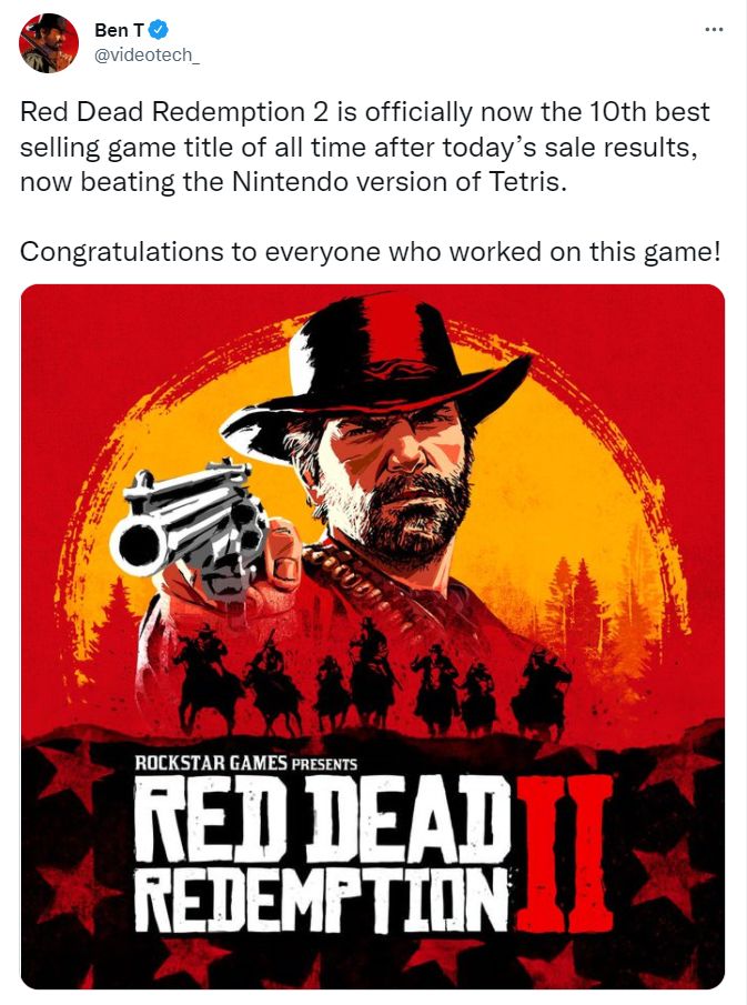 Thành tích này cũng đã giúp cho Red Dead Redemption 2 có một chỗ đứng vững chắc trong top 10 trò chơi bán chạy nhất mọi thời đại và xếp ngang hàng với tựa game xếp hình Tetris kinh điển của Nintendo.